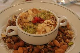 | الحلو ام علي المقادير نصف كيلوجرام من العجينة المورقة أي البف باستري نصف كوب من اللوز نصف كوب من الزبيب الخالي من النوى نصف كوب من الجوز المفروم خشنا نصف كوب فستق حلبي مفروم ثلاثة أرباع كوب من السكر أربع أكواب من الحليب ملعقة صغيرة من الفانيليا علبة قشطة أو قيمر للوجه ترق عجينة البف باستري جيدا ثم تقطع الى أربعة مستطيلات متساوية تخبز هذه العجينة في صوان مدهونة بالزبد في فرن متوسط الحرارة حتى تنتفخ الفطيرة وتحمر تخلط المكسرات مع بعضها يدهن الطبق الخاص بالفرن بالزبد يقطع أحد مستطيلات الفطيرة باليد الى قطع متوسطة الحجم وتمد في الطبق ويرش سطحها بالمكسرات تقطع باقي المستطيلات ويغطى بها فوق المكسرات يرش ما تبقى من خليط المكسرات توضع طبقة من البف باستري المقطع على الوجه يذاب السكر مع الحليب ويصب فوق السطح يدهن الوجه بالقشطة بالتساوي ويرش قليل من السكر البودرة فوق القشطة تخبز في فرن متوسط الحرارة مدة نصف ساعة حتى يصبح السطح ذهبيا تقدم ساخنة بعد رش الوجه بالمكسرات المحمصة | |||||